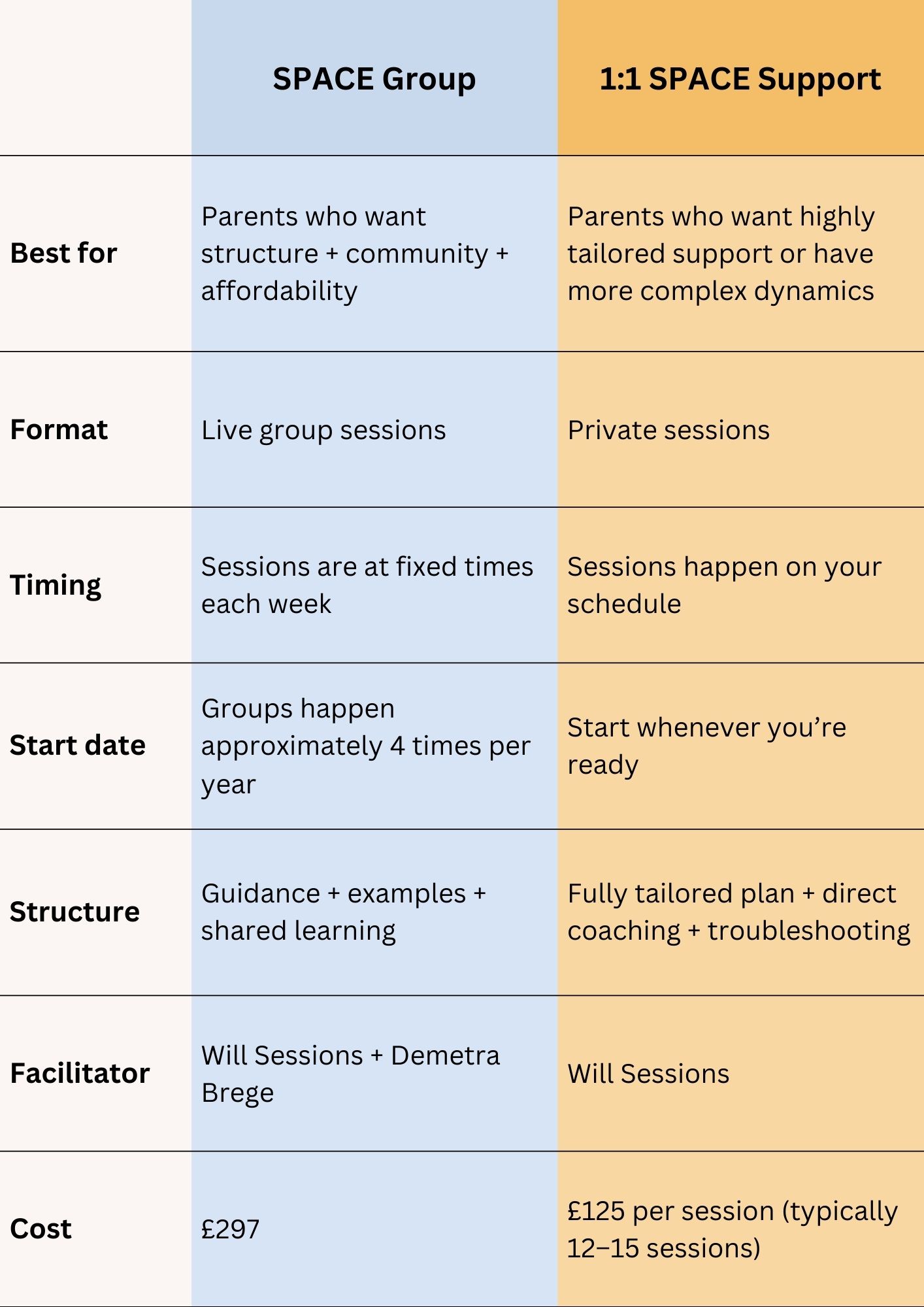 SPACE gives you a clear framework and the support to put it into practice, so you’re not guessing, negotiating or walking on eggshells. The work is focused and time‑limited, but what you learn will support you and your child long after the programme ends.